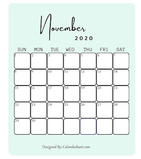 This simple, minimalistic Printable November 2020 calendar template is elegant at the same time. The large square boxes facilitate enough space for writing notes and extra notes bar at the bottom. The dates mentioned in the boxes have a small size, so as to provide huge spaces to jot down the notes and reminders. This clean template is ideal to be put on the office desks or even on the walls so as to get reminded of the various errands which are still to be performed. To more stylish and cute printable calendars visit here: https://www.calendarkart.com/november-calendar/